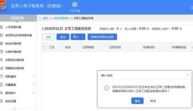 4、选择左边的综合所得税申报,右边正常工资薪金所得后面点填写,界面中弹出数据后点击确定即可;