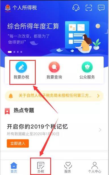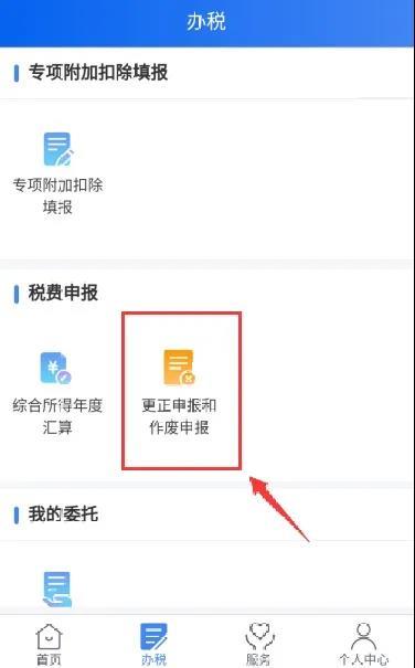 1、登录个税APP后,点击【我要办税】模块或者底部菜单栏【办税】,再点击【更正申报和作废申报】,进入详情界面。