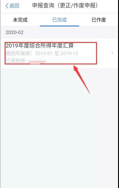 2、进入详情界面,选择【已完成】,点击【2019年度综合所得年度汇算】,选择【申报记录】,点击【作废】即可。