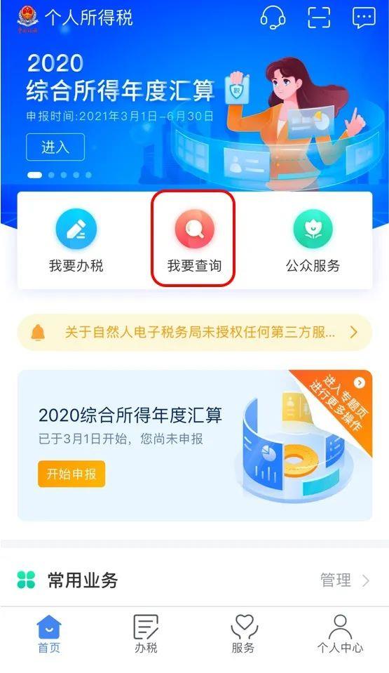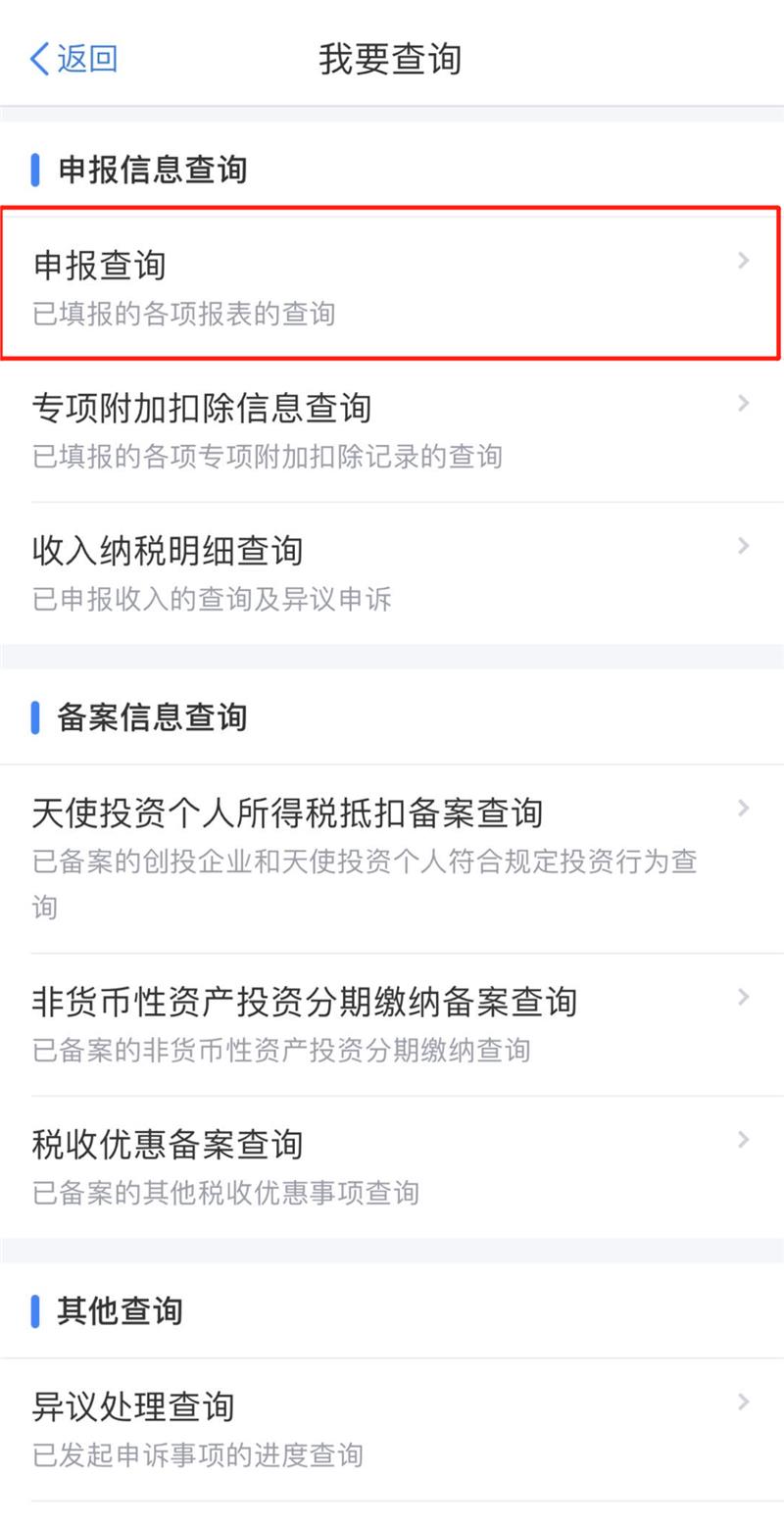 方式二:登录手机个人所得税APP,首页【我要查询】或者底部菜单点击【服务】,在“申报信息查询”栏点击【申报查询】。