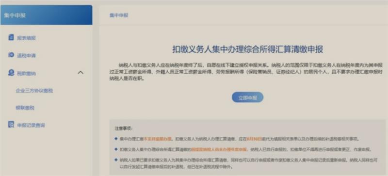 在【集中申报】页面中,扣缴义务人可以为居民纳税人进行综合所得汇算清缴申报。