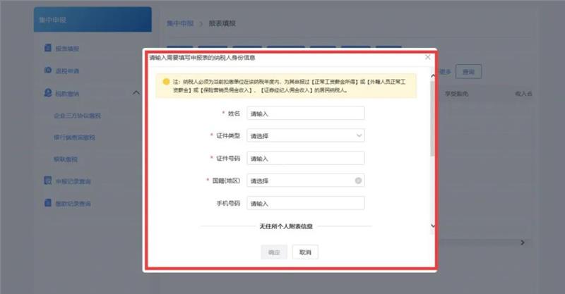 点击添加按钮,添加需要办理综合所得汇缴的职工员名单,录入姓名、证件类型、证件号码、国籍、手机号,点击确认按钮。