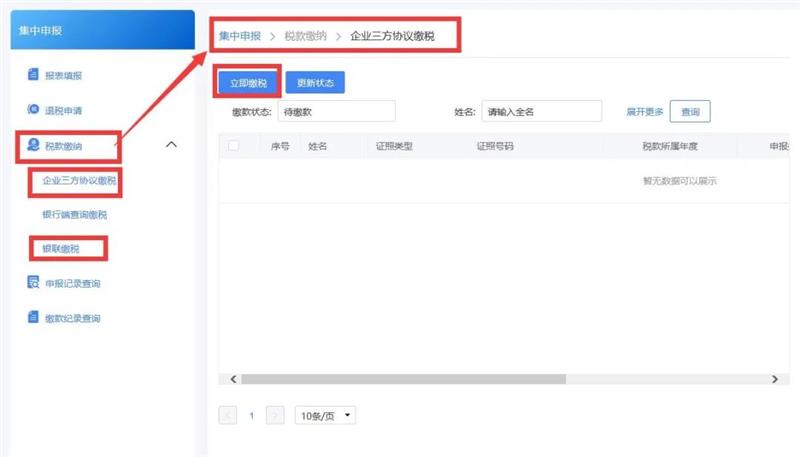 汇缴需要补缴税款的,点击左侧税款缴纳按钮,可以选择企业三方协议缴款,也可以选择银联缴税。