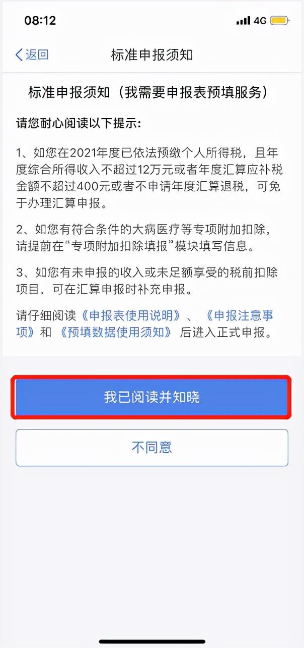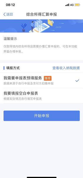 填报方式有两种选择:建议选择“我要申报表预填服务”,也可以选择“我要填报空白申报表”;如有需要可在申报前查看收入纳税数据,如对收入信息有异议,支持对收入明细进行“申诉”(具体操作点击这里);若无异议可开始申报,阅读申报须知后点击“我已阅读并知晓”。