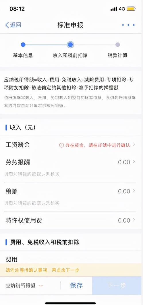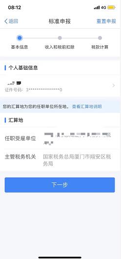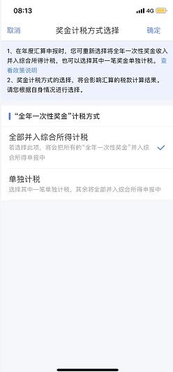 确认自己的基本信息是否有误,无误则进入下一步,在该页面中核对各项收入及税前扣除信息,如果您存在“全年一次性奖金”则点击“工资薪金”进入详情页进行设置:可选择一笔奖金作为全年一次性奖金单独计算纳税,也可全部并入综合所得;您可以在未提交申报前尝试不同的选择,查看计税结果来选择最优方案~