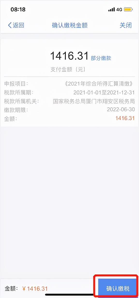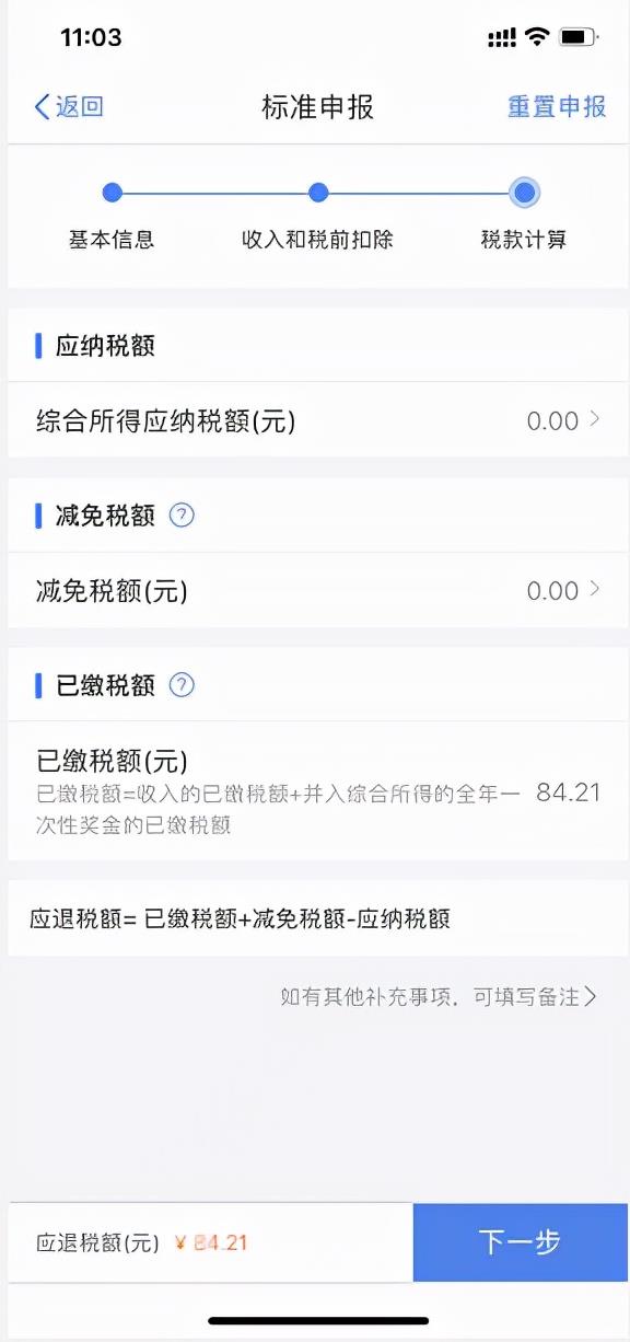 进入税款计算界面,根据上一步的收入及减除数据显示应纳税额、减免税额和已缴税额。页面左下方显示“应补税额”或“应退税额”,点击“下一步”;在阅读声明后点击“确认”即可。