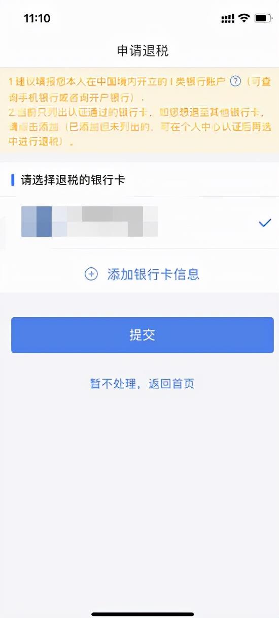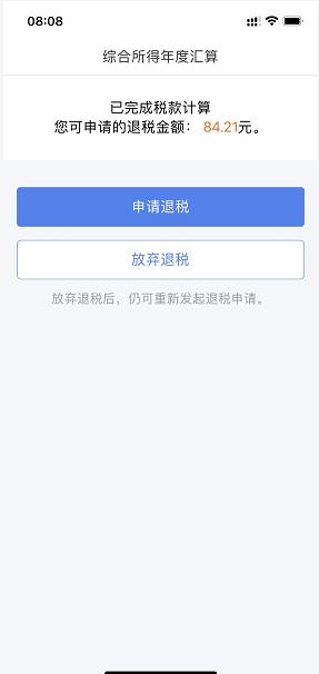 税款计算完成后跳转到退税页面,点击“申请退税”选择绑定的银行卡,点击“提交”即可。