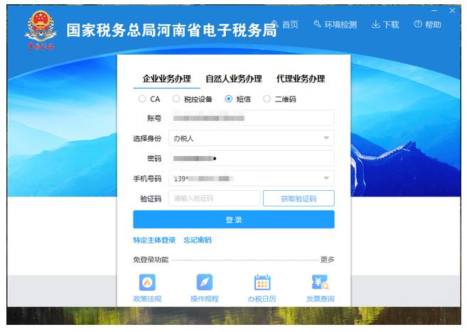 1:登录电子税务局:选择短信登录,输入账号、密码、选择身份(法人、财务负责人、办税人、购票员)发送验证码、输入验证码登录