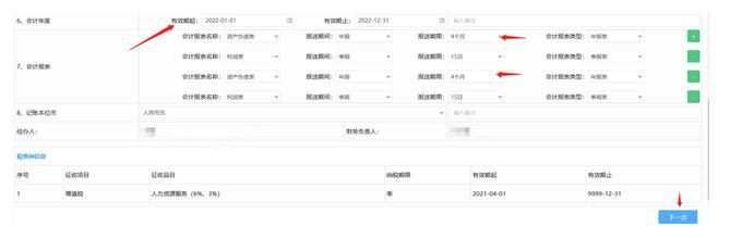 5、会计年度一般从本年度1号开始,到本年度31号结束。会计报表一般选资产负债表和利润表的年报和季报,如果是一般纳税人,需选择资产负债表和利润表的年报和月报。注意:年报报送期限需选择4个月,选择5个月税务局可能不会批准。其他报表可通过点击右边+号增加,根据公司实际情况选择报表。记账本位币一般选人民币元。全部填完后点击下一步。