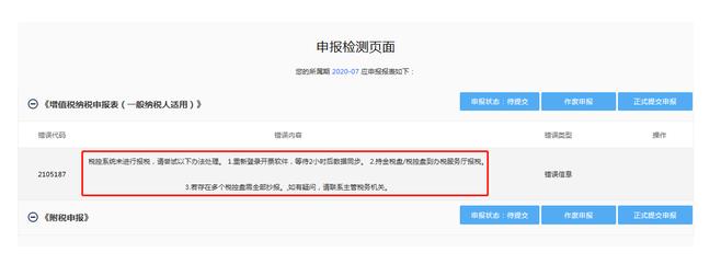 4.1.正式提交申报:如果显示如下提示表明金税盘未进行汇总上传,先进行抄税,然后再来提交申报。如果提示其他错误,返回错误处修改即可。