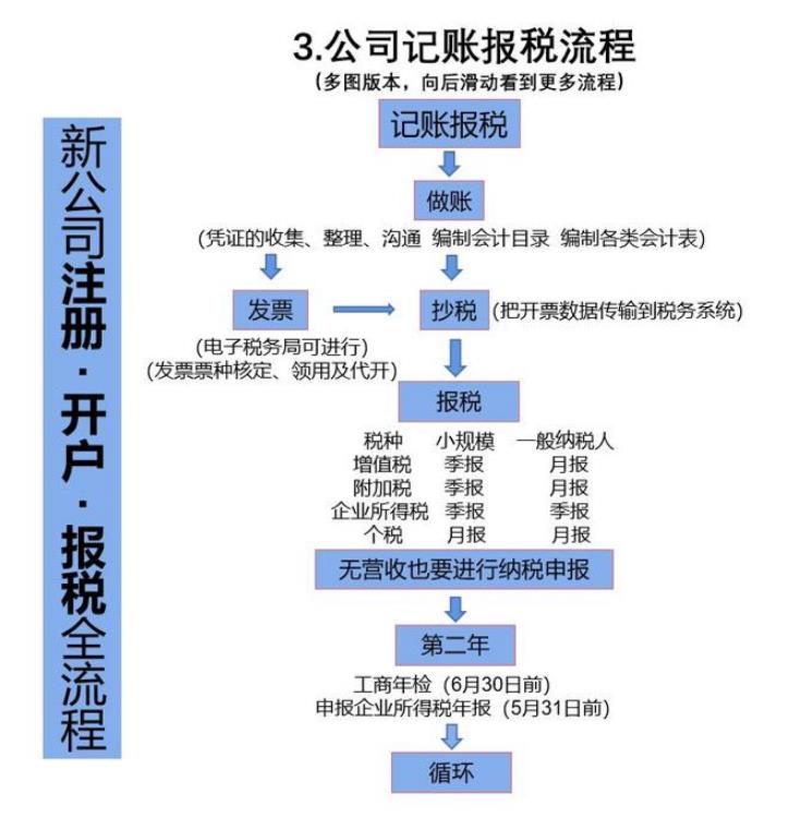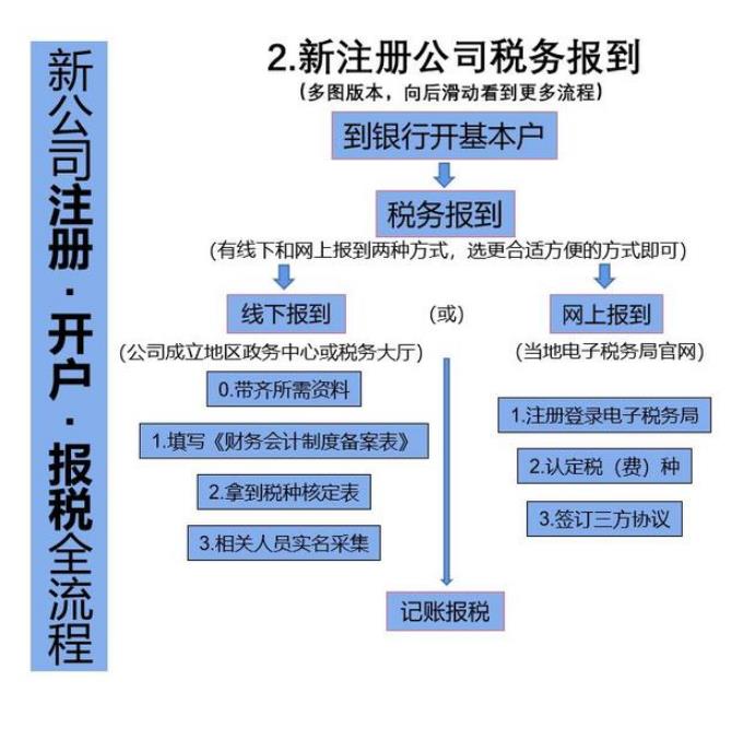 公司在注册之后,需要记账报税,流程的第一步是到银行开基本户,然后税务报到,这个税务报到分两种方式,一个是 线下,一个是网上,小编已经针对不同的税务报到方法更新在下面的文章里了,大家快来看看这篇刚注册的公司怎么记账报税的文章吧。