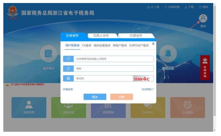 企业用户登录时,选择用户名、CA 或税控设备登录,以用户名登录为例,输入账号(纳税人识别号)、密码及验证码后,点击“登录”,系统自动校验密码及验证码,校验成功后进入下一步。