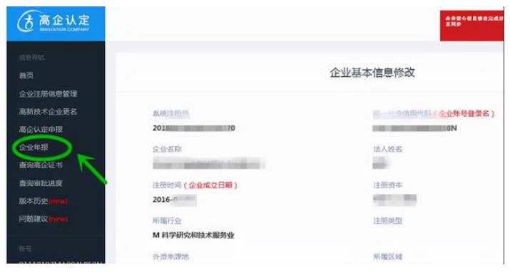 2、登陆高新技术企业认定,进入下图页面,点击左侧“企业年报”:
