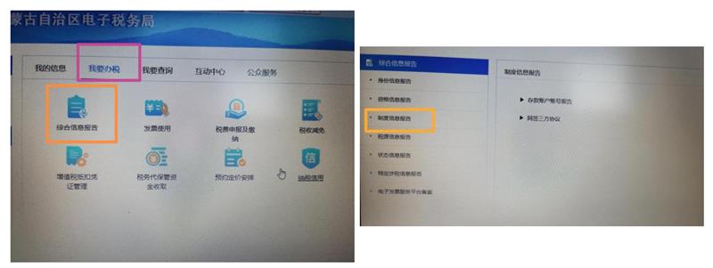 2.选择操作按扭里的“我要办税”,打开后找到“综合信息报告”的选项,点击进入,找到“制度信息报告”,点开后你会看到“财务会计制度及核算软件备案报告”选项,点进去。
