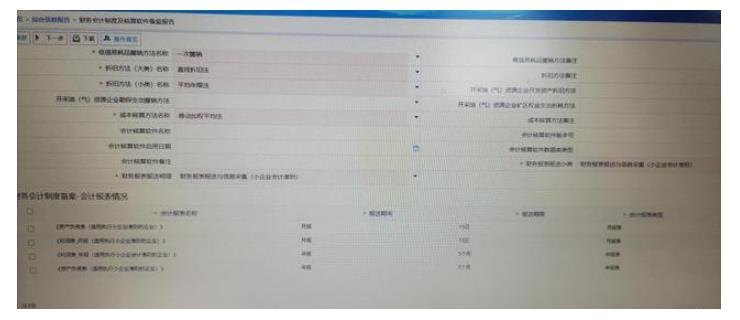 3. 点击进入一个新的页面,看下面的会计制度备案信息(下图),有的选的是企业会计准则,有的选的是小企业会计准则,操作方法是一样的。你点前面的小圆点后,下面就会显示你的相关备安信息,最下面有“财务会计制度备案-会计报表情况”