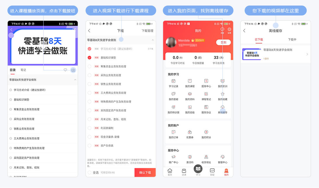 使用手机观看时需先需先联网将课件下载下来,下载后的课件可以断网观看:下载会计教练APP → 找到菜单【我的】 → 【离线缓存】 → 观看课程。